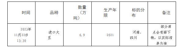 受中储粮油脂有限公司委托,2023年11月22日13:30在国家粮食和物资储备局粮食交易协调中心及联网的各省(区、市)湖北粮网组织开展进口大豆竞价交易,请交易会员通过湖北粮网官网(www.grainmarket.com.cn)“用户中心”,登录国家粮食交易平台,在专场列表中选择“政策性粮食轮换交易”参与交易。现就有关事项公告如下(重点提示内容详见加粗字体部分):